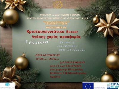 Με μεγάλη χαρά σας προσκαλούμε στα εγκαίνια του Χριστουγεννιάτικου Bazaar της «Ηλιαχτίδας»! Η λαμπρότερη γιορτή των παιδιών μας θα πραγματοποιηθεί την Τετάρτη 17/12/2025, ...