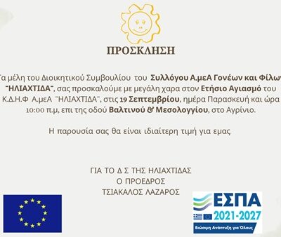 Την Παρασκευή 19 Σεπτεμβρίου 2025 και ώρα 10:00 π.μ, με Θρησκευτική Ευλάβεια, τελέστηκε ο Ετήσιος Αγιασμός μας, παρουσία ωφελουμένων – Γονέων –Φίλων μελών ...