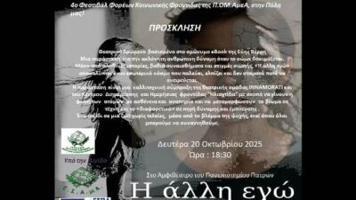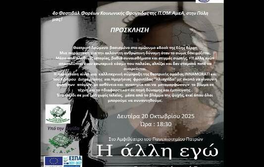 «Συμμετοχή, Αλληλεγγύη, Ενότητα» Στις 20 Οκτωβρίου 2025, ημέρα Δευτέρα , υποδεχόμαστε στην Πόλη μας το 4ο Φεστιβάλ Φορέων Κοινωνικής Φροντίδας, στο Αμφιθέατρο του Πανεπιστημίου Πατρών ...
