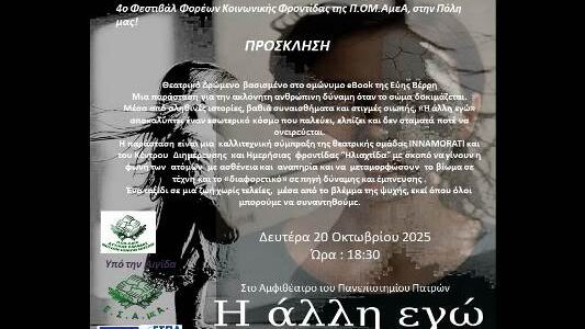 «Συμμετοχή, Αλληλεγγύη, Ενότητα» Στις 20 Οκτωβρίου 2025, ημέρα Δευτέρα , υποδεχόμαστε στην Πόλη μας το 4ο Φεστιβάλ Φορέων Κοινωνικής Φροντίδας, στο Αμφιθέατρο του ...