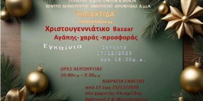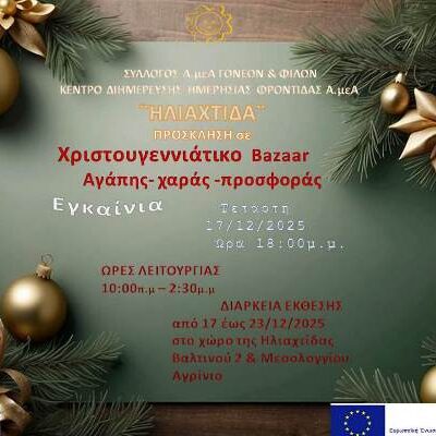Με μεγάλη χαρά σας προσκαλούμε στα εγκαίνια του Χριστουγεννιάτικου Bazaar της «Ηλιαχτίδας»! Η λαμπρότερη γιορτή των παιδιών μας θα πραγματοποιηθεί την Τετάρτη 17/12/2025, στις 18:00, στο Κ.Δ.Η.Φ. Α.μεΑ «ΗΛΙΑΧΤΙΔΑ». Οι ...